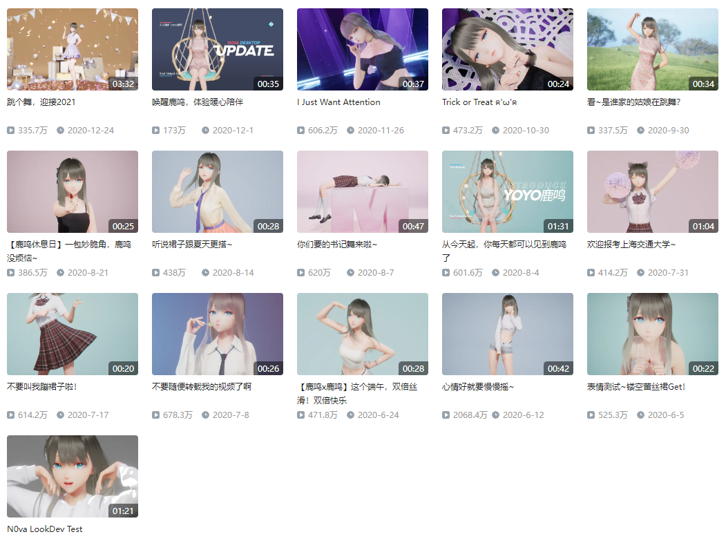 不过,一反米哈游的营销策略,鹿鸣在起初并没有被打上“米哈游出品”的tag,当她在2020年5月14日第一次在B站投稿自制舞蹈视频《N0va LookDev Test》时,留给观众的印象只是个有着浅灰色的头发、蓝色的眼睛的美少女,无论是从模型风格还是视频内容都与米哈游的其他产品相差甚远,不过,虽然初登场的鹿鸣并没公开自己与米哈游之间的关系,但其精美的模型、高水平的头发与布料渲染、以及流畅的动作,依旧为她赢得了不少B站用户的关注。
