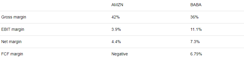 同样,这种比较有利于阿里巴巴。亚马逊仅在一项利润指标(毛利率)上击败了阿里巴巴,但它在这方面的胜利很小。与此同时,阿里巴巴比亚马逊的净利润率几乎翻了一番。在盈利能力方面,阿里巴巴同样更优。