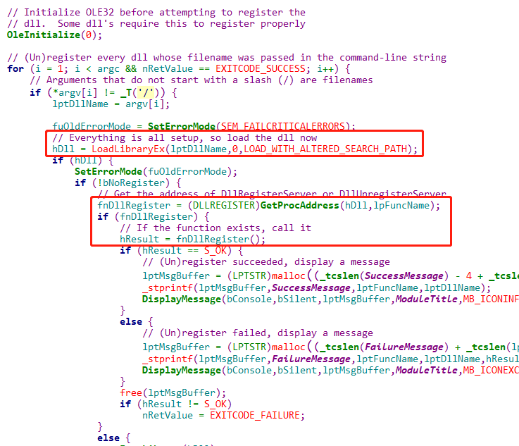 代码中是调用LoadLibraryEx接口去加载dll库的,传入的参数为LOAD_WITH_ALTERED_SEARCH_PATH,并且也是获取dll控件库中的DllRegisterServer去进行注册的。