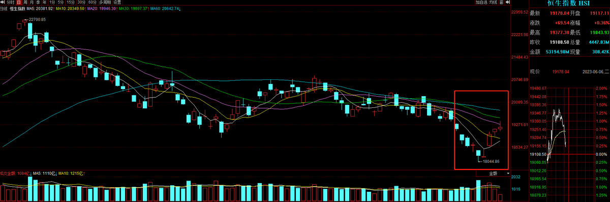 恒生指数先是延续5月跌势,较1月底的52周高点下跌逾20%,再到周五一根大阳线扭转颓势,拉出“V”型反转。