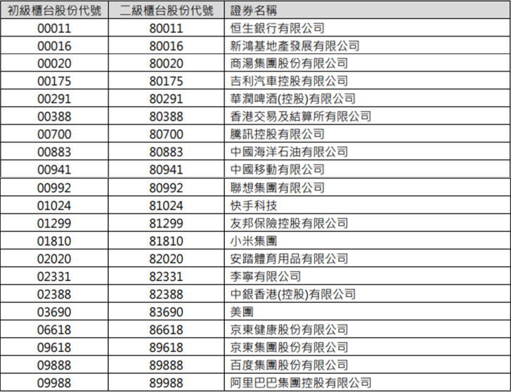 港股研究社了解到,首批21只证券包括:恒生银行、新鸿基地产、商汤集团、吉利汽车、华润啤酒、港交所、腾讯控股、中国海洋石油、中国移动、联想集团、快手科技、友邦保险、小米集团、安踏体育、李宁、中银香港、美团、京东健康、京东集团、百度集团、阿里巴巴。