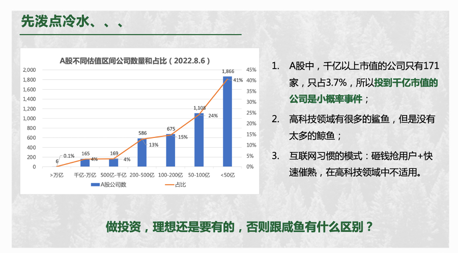 我们都知道,投资到千亿市值的公司是概率极小的事。A股里面千亿以上市值的公司仅有171家,只占了A股所有上市企业的3.7%。即使再加上中概股和港股,以及未上市的过千亿市值的企业,国内或许总共也只有200多家。另外,在高科技领域里有很多的鲨鱼,但是没有太多的鲸鱼,专精特新小巨人(鲨鱼级别的公司)才是高科技领域的常态。
