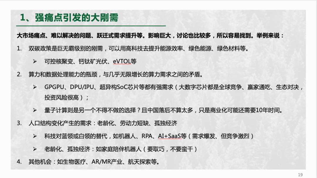 举例来看,第一,双碳政策是国家的基本政策,这是一个超大刚需,其中会产生巨量的需求和机会,比如可控核聚变、钙钛矿光伏的重要程度大大提升,如果能实现技术突破,部分取代现有的发电技术,将会产生新的超大市场。