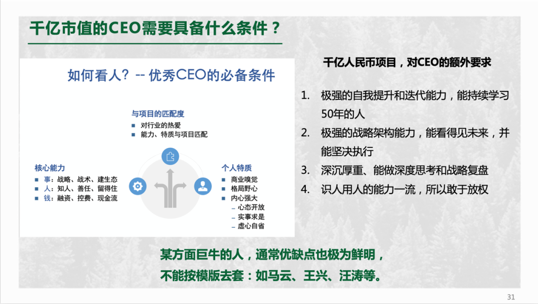 再说一流和二流团队的问题。在高科技领域投资,尤其是要找这种千亿级别的投资机会的话,团队是否一流至关重要。在我看来,如果一个团队的战略能力、战术能力、生态建设能力、人才吸引和保留能力、后续融资能力都很强,才能称得上是一流团队。