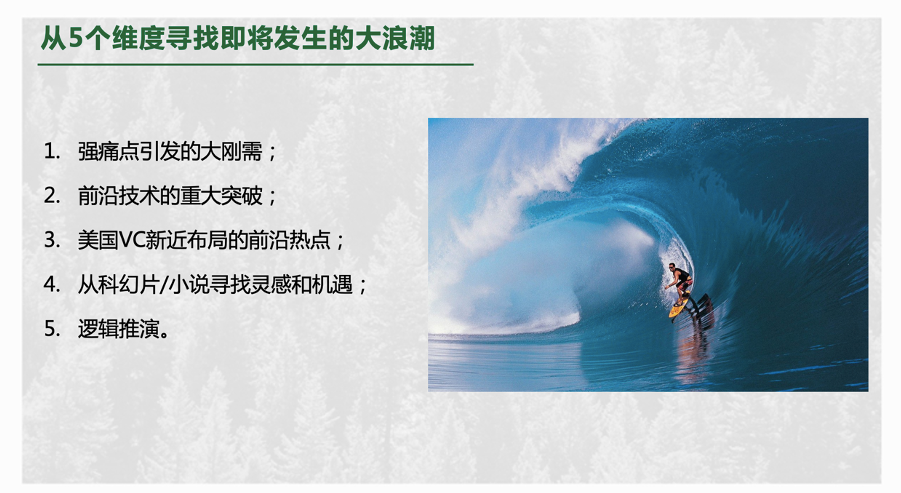 寻找未来科技的投资机会时,我们可以从五个维度去寻找机会:一是寻找大的刚需痛点,二是寻找重大的技术突破,三是探究美国VC的前沿布局,四是从科幻片或小说里寻找灵感和机遇,五是通过逻辑推演预测行业棋局和终局。