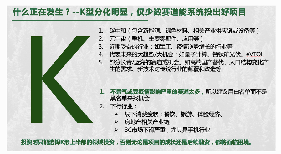 今年的寒冬可能是有史以来最寒冷的,但幸运的是,明年春节之后大概率会回暖。我对行业景气度的判断是:今年遇冷、明年回暖、长期坚挺、K形分化。我们要对中国在全球范围内长期的核心竞争力,以及高科技投资在中美竞争之间发挥的积极作用要有足够的信心,因此,长期来看,投资行业仍旧非常坚挺。但将眼光放在近期,今年的资本寒冬的确很冷,且各赛道的景气度分化严重,投资人需要擦亮眼睛,主动避开景气度下行的赛道。