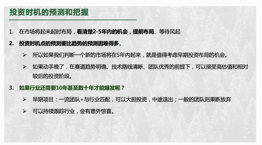面向未来做投资,经常出现的情况是,很多时候,我们发现了未来科技的踪迹,但很多未来科技仍需要很多年的时间才能发育成熟,比如量子计算就可能是十年之后才会爆发的机会。那该怎么办?这就需要投资人有把握投资时机的能力。我建议着重关注未来两到五年之内的投资机会。如果技术成熟的时间更长,但是团队在行业中属于一流团队,并且该团队的背景和经历与行业匹配程度很高,在估值合理的前提下,可以大胆投资,因为中间获利退出的概率还是很高的。另外,正因为我们可以通过系统性方法提前预测到未来,所以反倒在心态上不用着急,可以保持关注、慢慢学习、慢慢寻找。只要你能持续关注,或许有一天机会就自己撞上门了。