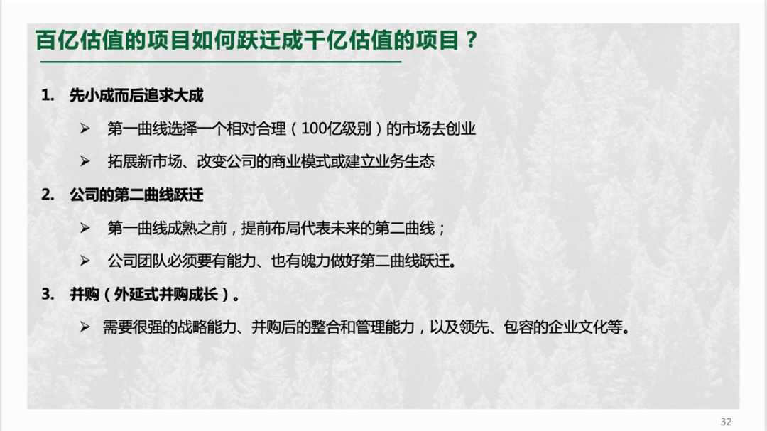 对绝大部分初创企业来说,或许更务实的做法是先在百亿市值的赛道上站稳脚跟,而后再考虑怎么去做好第二曲线跃迁,把公司拉到一个市场空间更大、更有想象力和吸引力的第二曲线里。也可以等公司上市之后,通过并购去获得新的业务和持续成长空间。