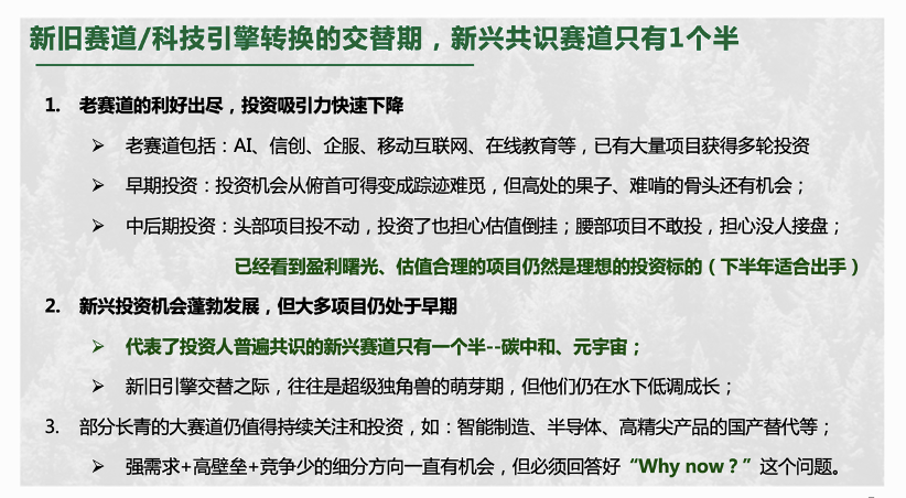 从新旧赛道上来说,老赛道里很多可投、好投的领域都已经被投资殆尽,而且大多数领先的项目都已拿到了多轮融资,在这里挖掘新的早期投资机会是非常困难的。另外,在中后期投资方面,目前也面临着一些不利状况:一边是头部项目可能投不动,投资之后也有估值倒挂的风险;另一边是很多机构不敢投腰部项目,担心之后没有人接盘。我想强调的是,下半年之后,不少项目估值都会有比较明显的降低,会是眼光犀利的投资人捡漏的好时机。中后期、能看到盈利曙光并且估值还算合理的项目是好投资机会,可以大胆下手。