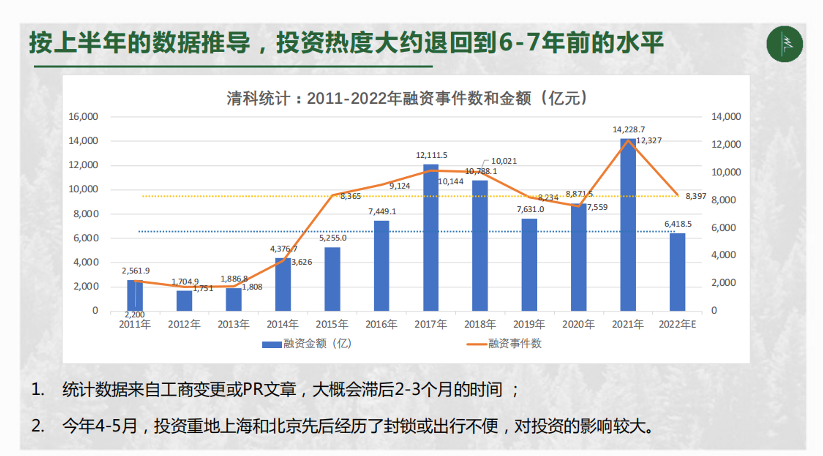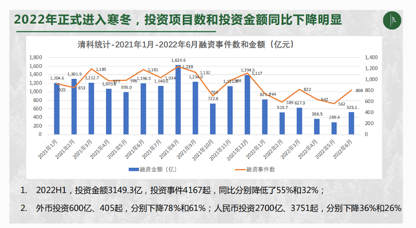 资本市场正在经历寒冬。从数据上看, 2022年1-6月,国内投资金额为3149.3亿,投资事件4167起,同比分别降低了55%和32%;其中外币投资600亿、405起,分别下降78%和61%;人民币投资2700亿、3751起,分别下降36%和26%。
