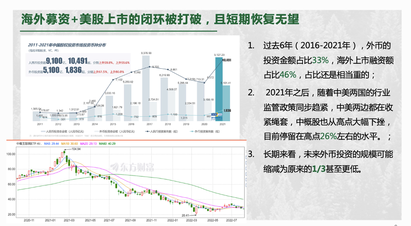 美股上市海外的闭环被打破,对我们的影响将会有多大呢?从2016年到2021年的统计来看,外币资金的投资金额占了中国一级市场的三分之一,而海外上市融资金额占了接近一半,有46%之多。可以说,美元基金对中国高科技以及新兴产业的成长有着非常大的贡献。