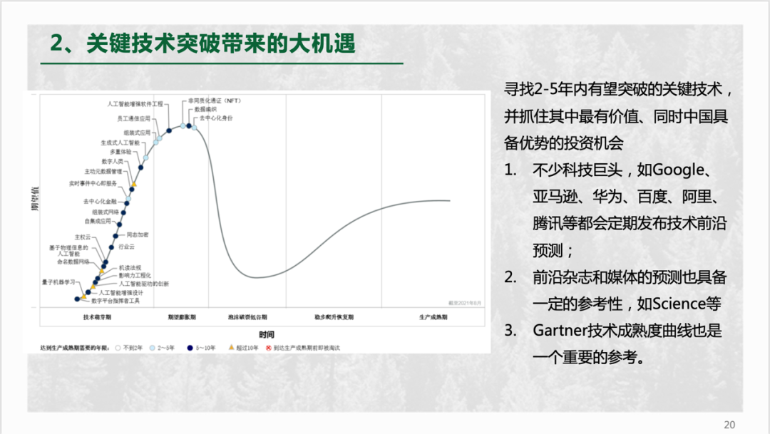 第二个维度,关键技术突破所带来的大机遇。投资人要做的是,寻找2-5年有望突破的关键技术,并判断哪些技术会成为新的大趋势。在这方面,我们自己也找到一些渠道和技巧,比如科技巨头每年发布的技术前沿预测报告、Gartner的成熟度曲线、以及Science、Nature等顶刊在某方向上的发文数量增长趋势等,都有很好的参考或借鉴意义。