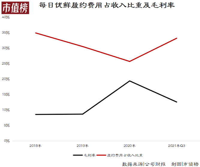 与之对应,每日优鲜2018年-2020年以及2021年前三季度的履约费用为分别为12.39亿元、18.33亿元、15.77亿元和16.18亿元,占收入比重均在25%以上。同期,公司毛利率最高都不到20%。