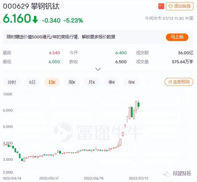 在政策“开路”、技术伴随下,近期攀钢钒钛股价跳跃式暴涨,短短2周6次直拉涨停板,由6月28日的收盘价3.66元/股上涨至13日盘中的6.16元/股,涨幅近70%,目前市值530亿元。