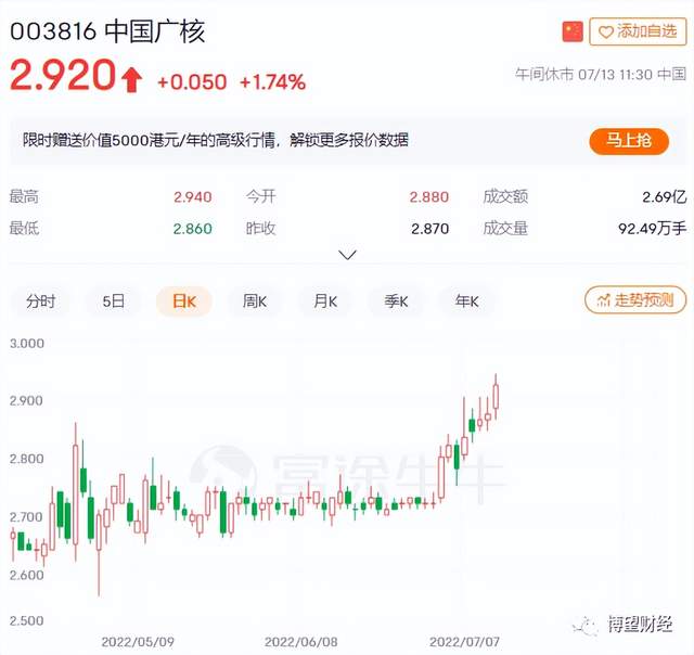 尽管中国广核股价涨幅没有攀钢钒钛那么夸张,但步入7月以来也经历着久违的持续上扬,由7月1日的收盘价2.72元/股上涨至7月13日盘中2.92元/股,涨幅7.4%,目前市值1343亿元。