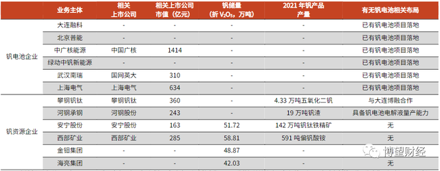 据公开资料显示,在钒上游原料环节,主要以攀钢钒钛、河钢股份为代表,前几大市占率超80%,集中度高;钒电池相关企业主要为大连融科、中广核能源、国网英大和上海电气,目前均已有钒电池项目落地。