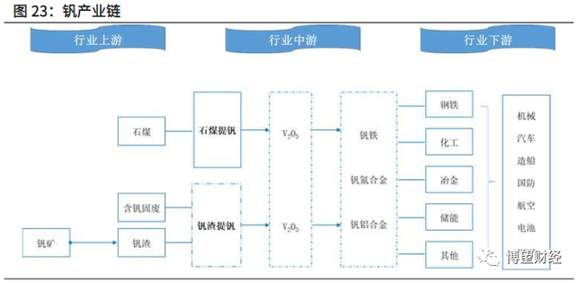 在钒产业链条上,上游主要为钒矿(含钒固废)、通过石煤加工成五氧化二钒和三氧化二钒,再进一步加工为钒铁、钒钛合金等应用于下游钢铁、化工等领域,其中钢铁领域中的占比最高,达90%以上。