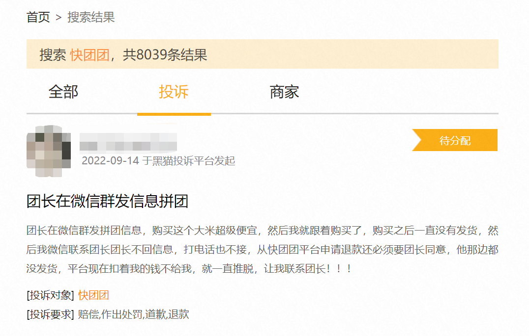 独立运营的快团团,整个小程序的开发会更加具有独立性和针对性,那就是“工具属性”,快团团不需要去考虑基于拼多多的内容稳定性。但快团团的负面影响也不可忽视:低准入门槛会造成货源问题,团购也是完全依赖团长信誉度进行,平台没有账期,也不担保交易,售后和履约是最大问题。在 “黑猫投诉”上,关于“快团团”的投诉达8000多条,不少是团长不发货和收到虚假产品。