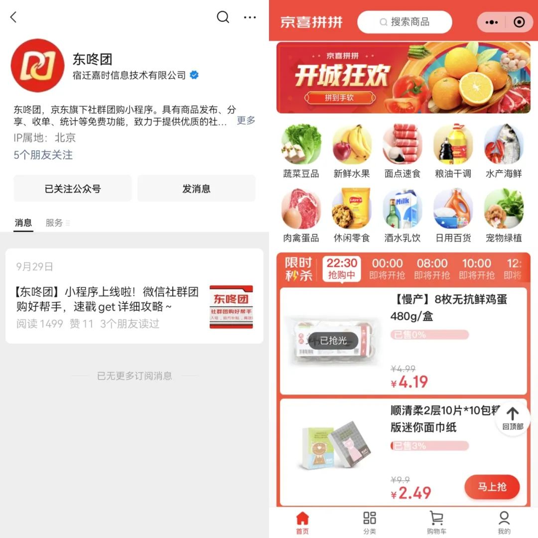 相比于有着小程序、京喜APP入口的京喜拼拼,还在内测的东咚团更加低调,只悄悄上线了微信小程序,并且主打社群团购——预售模式,微信社群裂变,依赖团长信用背书将有相同购物需求的消费者汇聚起来,团购品类也会更加繁多。