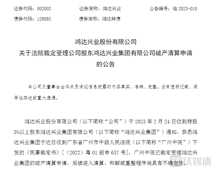 让鸿达兴业两次收函的起因,是控股股东鸿达兴业集团的破产重整。1月4日晚间,鸿达兴业公告显示,因经营情况发生变化,不能清偿到期债务,资产不足以清偿全部债务且缺乏清偿能力,鸿达兴业集团向广州中院申请破产清算。2月25日,鸿达兴业称该申请已获受理。