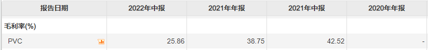 营收占比下滑的同时,毛利率表现也并不乐观。鸿达兴业未在2020年年报中披露相关产品的毛利率情况,但2021年以来,毛利率下滑明显。2021年上半年PVC产品毛利率为42.52%,但至2022年上半年毛利率已下滑至25.86%,跌去了16个百分点。