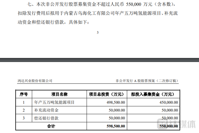 泥足深陷的鸿达兴业在2021年欲再次利用融资解决债务危机,根据2021年6月公布的预案显示,鸿达兴业欲募资55亿元,其中45亿元用于年产五万吨氢能源项目,5亿元用于补充流动资金,5亿元用于偿还银行贷款。但预案公布近两年,募资推进并未有实质性进展。