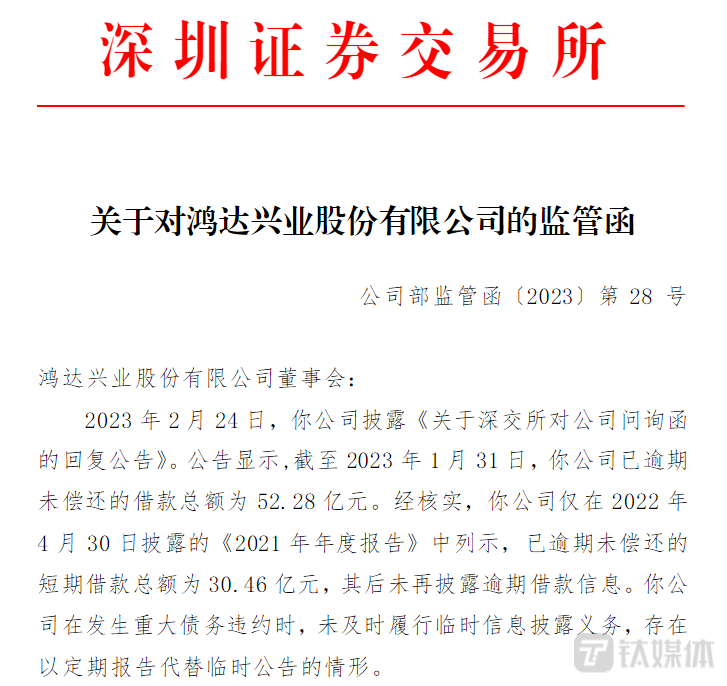 引起深交所注意的是,鸿达兴业最近一次披露逾期借款信息是在2021年年报中,彼时已逾期未偿还的短期借款总额为30.46亿元。深交所在监管函中表示,公司在发生重大债务违约时,未及时履行临时信息披露义务,存在以定期报告代替临时公告的情形。钛媒体APP致电鸿达兴业进一步了解情况,相关工作人员表示均按照规则披露相关信息。