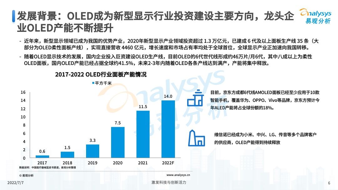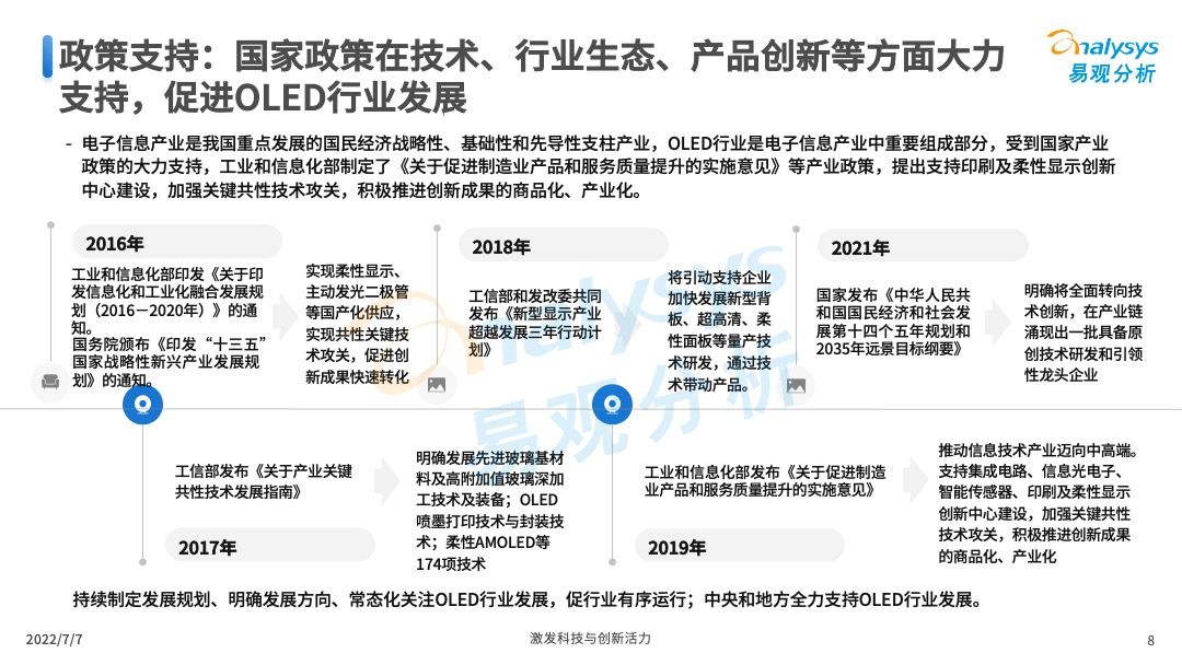 中国制造目前面临需求收缩、供给冲击、预期转弱等压力,制造业急需发展和稳定一批核心企业,专精特新之路能够为中国制造提供最有力的支撑。同时新型显示OLED行业是我国电子信息产业的重要基石之一,拥有较强的带动力和辐射力,吸引国内研究所、企业、资本等多方注意,成为了电子信息产业领域竞争的新高地。随着技术的发展与突破,我国在OLED(有机发光显示)技术上有了长足的进步,OLED产业是指有机半导体材料在电场作用下发光的技术,是目前公认最具有发展前景的新型显示技术之一,也是国际上新型显示领域的一个竞争热点。