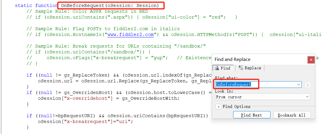 可以直接在fiddler中按Ctrl+R,或者在fiddler中点击菜单栏的Rules-Customize Rules,弹出弹窗后,按Ctrl+F搜索关键字段OnBeforeRequest