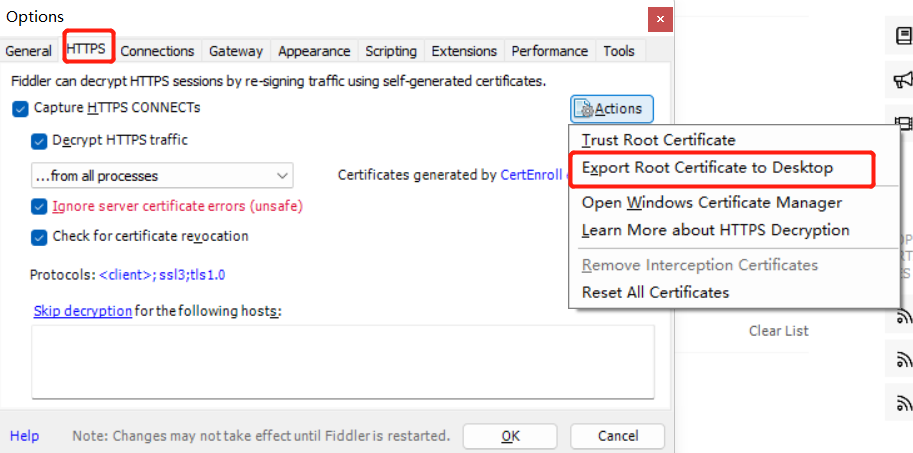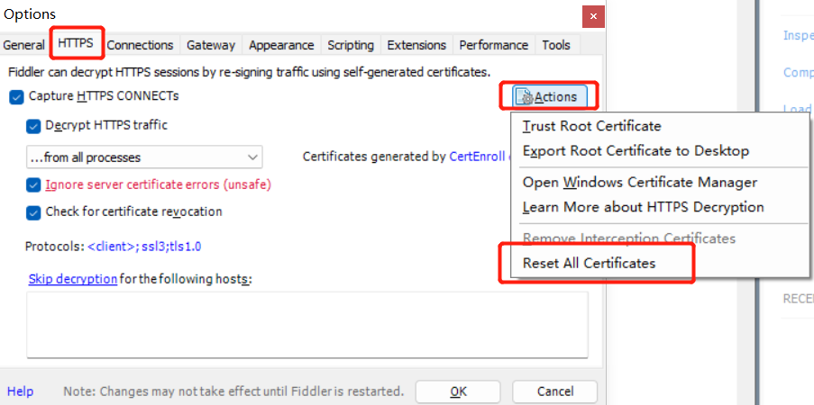 点击HTTPS, 点击右边Actions,选择Reset All Certificates,如图所示,然后疯狂点击yes和安装就可以了,最后重启Fiddler即可
