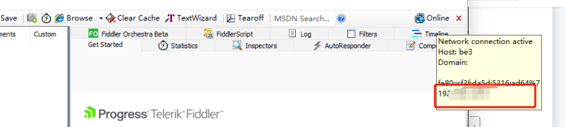 ②fiddler右上角Online也会显示你的主机ip,如下图