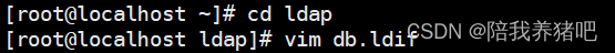 - 在db.ldif文件中编辑如下内容,目的就是替换上图中olcDatabase={2}hdb.ldif中 olcSuffix、olcRootDN、olcRootPW这三个字段的内容