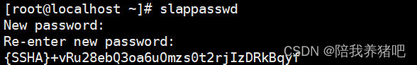 - 该密码是LADP服务器的管理员根密码,输入slappasswd后提示输入密码(123456)与确认密码,系统会输出一串加密后的字符串(保存好加密后的字符串,后面需要使用)