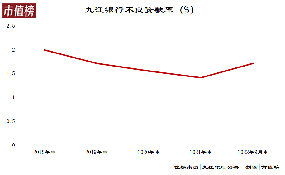 回到不良贷款率,2022年,九江银行这项指标开始回升,到三季度末,又升至1.71%。
