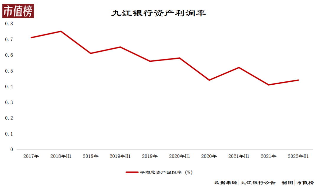在九江银行的年报中,资产利润率即为平均总资产回报率,自2019年开始,这一数值就一直低于0.6%,且越来越低。2022年上半年,资产利润率为0.44%,这并非由于资产获利能力好转,而是“上半年利润率高”,是九江银行一直以来的特点。