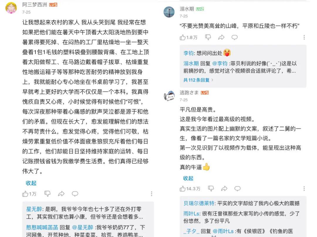 短视频编导罗布言总结了自己的观后感:“顶级文案+朴实画面,没有技巧,全是感情。”
