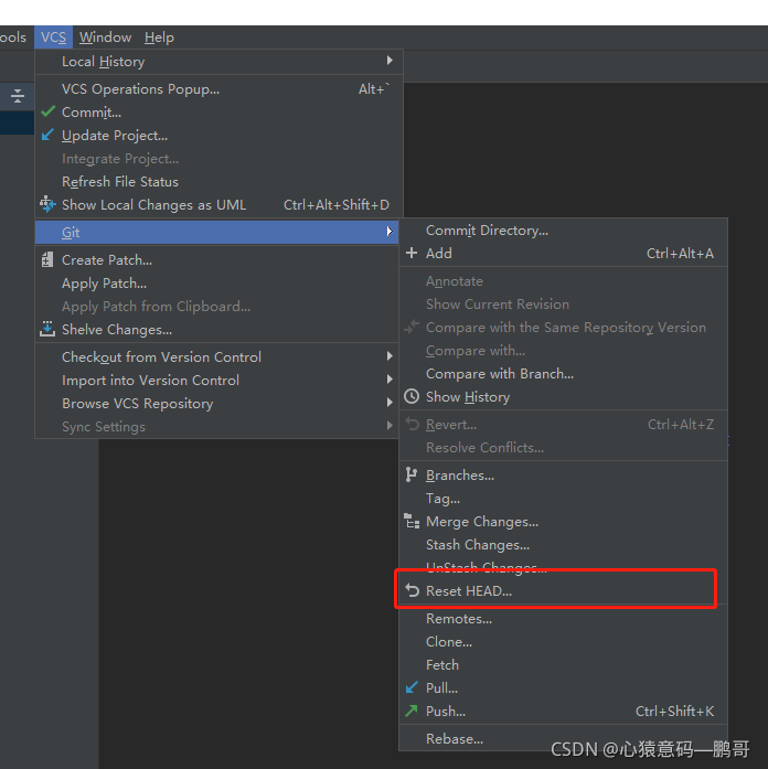 找到VCS--Git--Reset HEAD,不同的idea版本位置可能不一样,我的是IntelliJ IDEA 2018.2.2