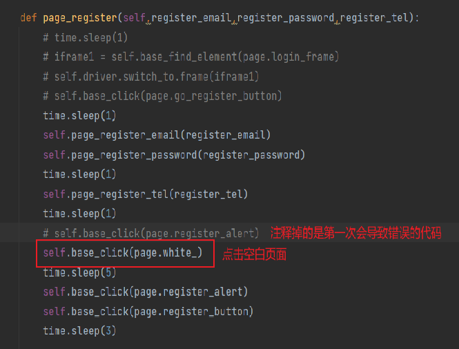 我第一个想法是既然是失去焦点,那么后续本来就要点击 同意服务条款 ,所以我先进行一次点击单选框的点击事件,输入验证码后再次点击单选框(由于第一次点击是失去焦点并增加验证框,所以并不会勾选,所以需要再次勾选) 事实上这样处理是在这个测试用例中可以的,但是当测试用例变为 手机号码不全或者手机号码格式有问题的时候,这一次的点击单选框事件会触发(应该是由于手机号错误而没有弹出验证框,导致这个事件顺利触发了)那么后续我再次点击时,会导致单选框不被勾选而出错。 那么我提供了两种解决方法,一种是直接失焦,一种点击事件,点击空白处,具体代码在下一页。