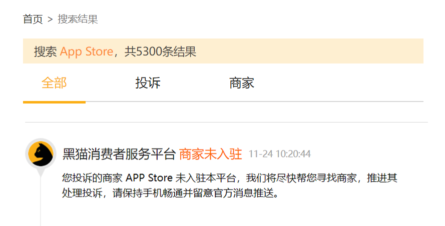 而在黑猫投诉平台上,关于App Store的投诉共计有5300条,其中大多数都是“软件乱扣费”、“App无法退款”、“App Store自动扣费”等问题。更令消费者失望的是,苹果公司压根没有入驻黑猫投诉平台,所以无法处理消费者投诉。