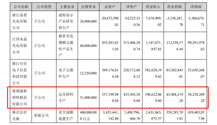 实际上,夜视丽系水晶光电分拆而来。据招股书披露,夜视丽前身为椒江市玻璃集团公司,成立于1993年11月,曾用名为浙江夜视丽反光材料有限公司。水晶光电于2014年完成对夜视丽的收购。