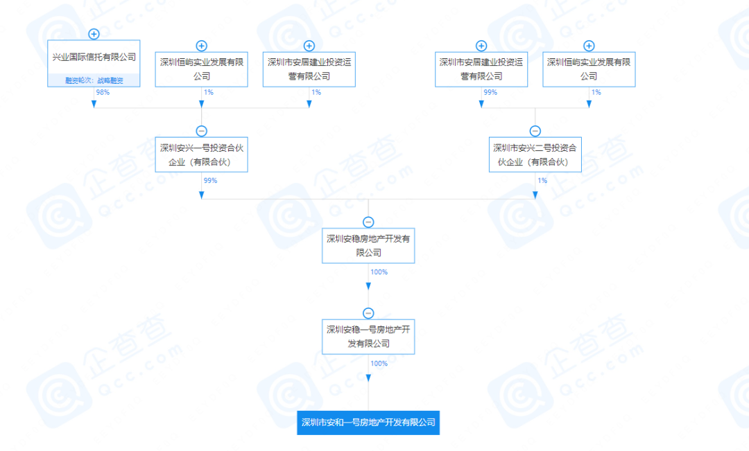 从最新这笔交易来看,恒大地块的接盘方安和一号房地产,由深圳安稳房地产通过深圳安稳一号房地产间接全资持股。深圳安稳房地产则由深圳安兴一号和深圳安兴二号分别持股99%、1%。