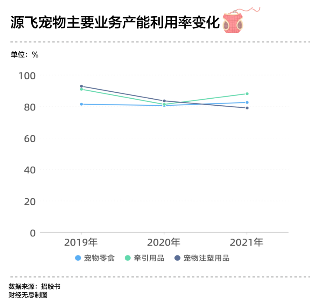 招股书显示,牵引用具的产能利用率从2019年度的90%下降到2021年的88.04%,而宠物零食的产能利用率也仅在80%上下。