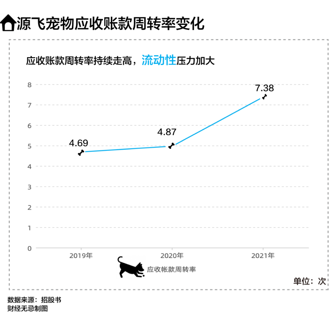 其中,源飞宠物应收账款周转率在2021年达到了7.38次,可比公司如依依股份则为5.4次,佩蒂股份为6次。