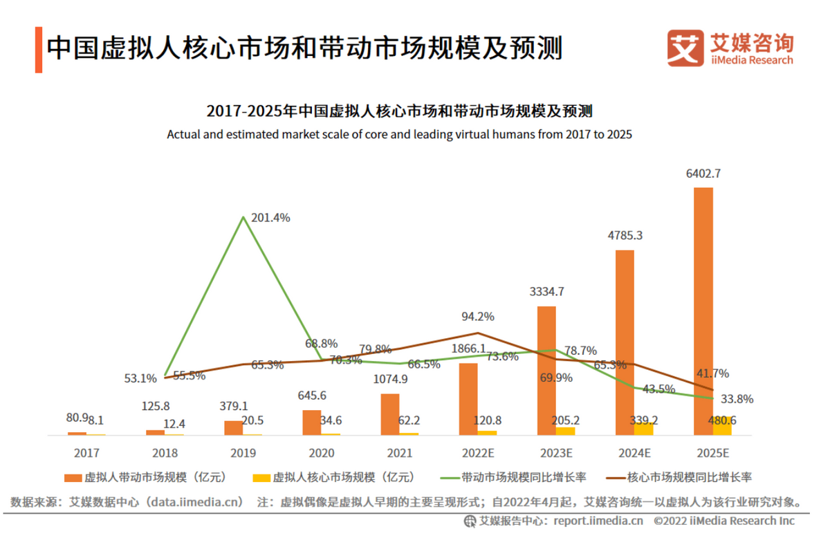 艾媒咨询发布的《2022-2023年中国虚拟人行业深度研究及投资价值分析报告》显示,2021年中国虚拟人带动产业市场规模和核心市场规模分别为1074.9亿元和62.2亿元,预计2025年将分别达到6402.7亿元和480.6亿元。