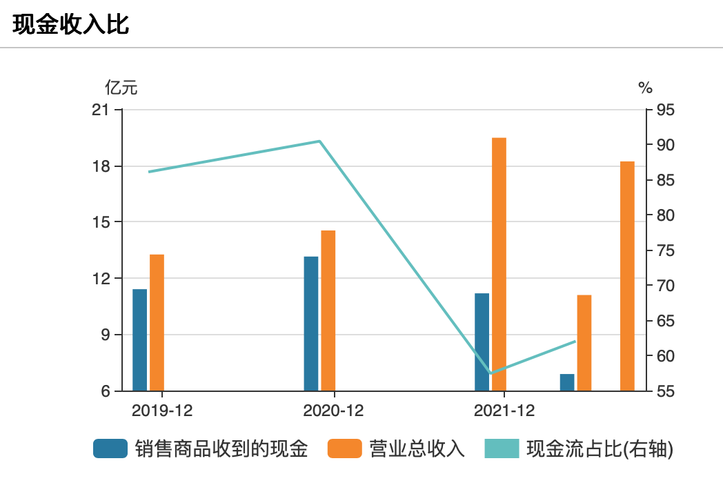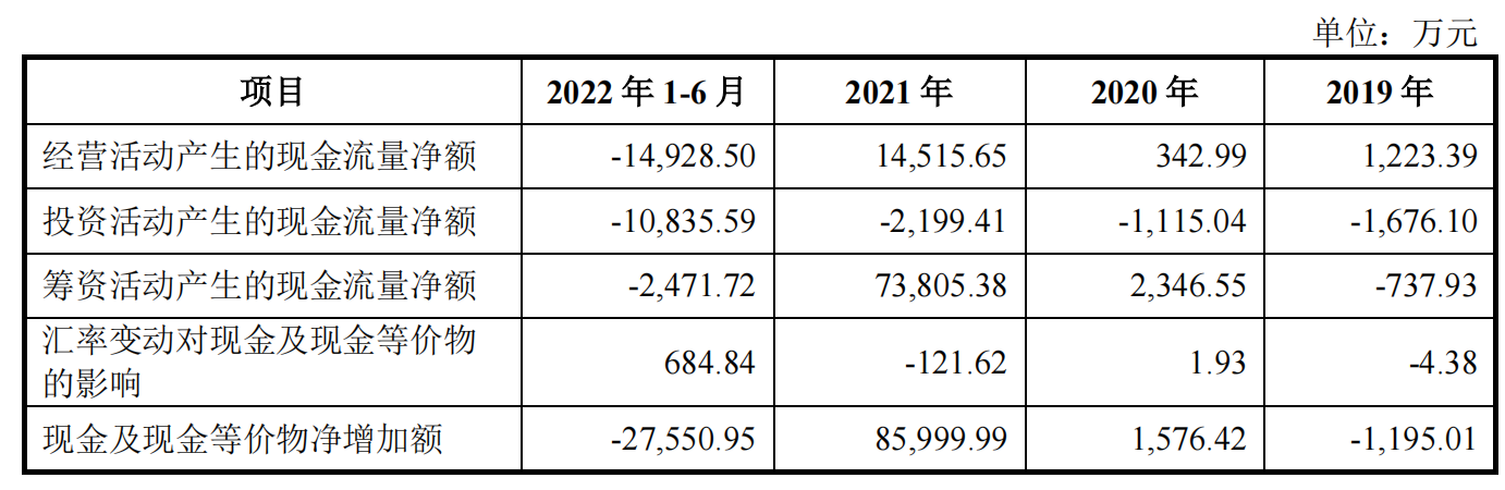 2019年至2021年,公司的经营活动现金流量净额分别为123.39万元、183.27万元和 1.45亿元,相对于各期实现的净利润处于较低水平。而到了2022年前三季度,其经营活动现金流量净额已下滑至-1.76亿元。