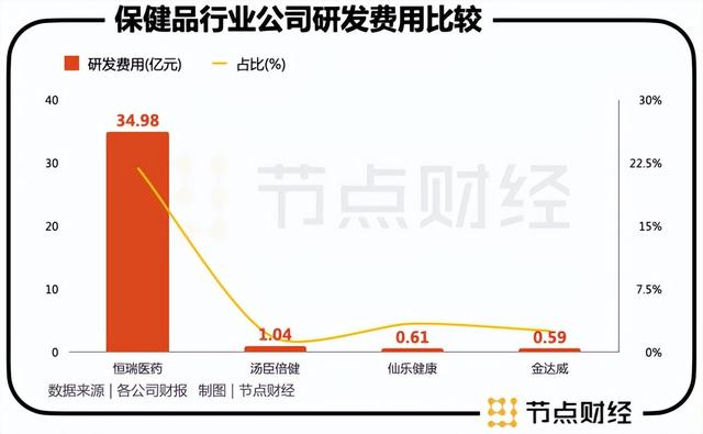 就拿“药茅”恒瑞医药做参照对象,2022年前三季度,恒瑞医药支出研发费用34.98亿元,占收入比重为21.93%;汤臣倍健支出研发费用1.04亿元,仅为20.86亿元销售费用的零头,占收入的比重为1.69%。