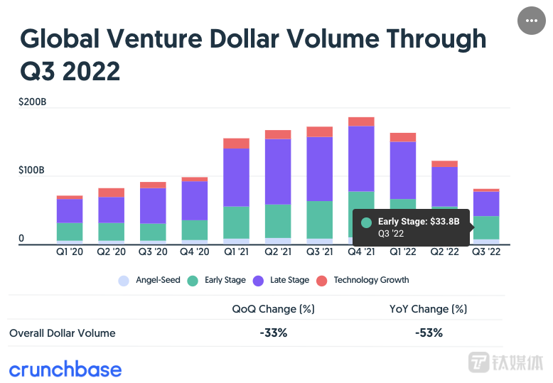 据Crunchbase News 10月6日公布的数据显示,2022年第三季度,全球风险投资总额达810亿美元,同比下降53%(900亿美元),环比下降33%,呈现连续三个季度下降。