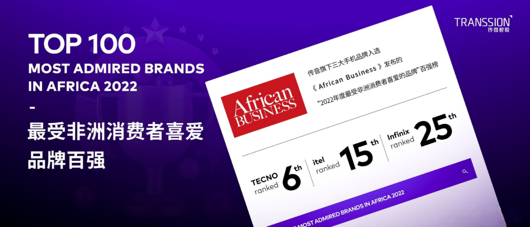 《African Business》发布的“2022年度最受非洲消费者喜爱的品牌”百强榜中,传音旗下的这三个手机品牌分别位列第6、15及25名。