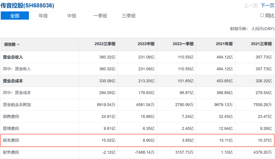 财报显示,传音控股2022年的研发费用增长迅速,由Q1的3.95亿元,增长到Q2的8.90亿元,Q3的15.02亿元。