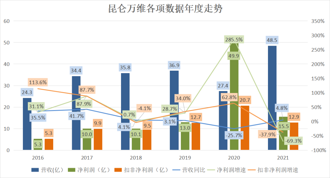 2021年,昆仑万维实现收入48.5亿,增长4.75%。(这里有个小疑问,在2020年的业绩报告里,2020年的营收是27.4亿,在2021年的业绩报告里,2020年的营收变成了46.3亿。按照27.4亿算,2021年不就增长77%了?)